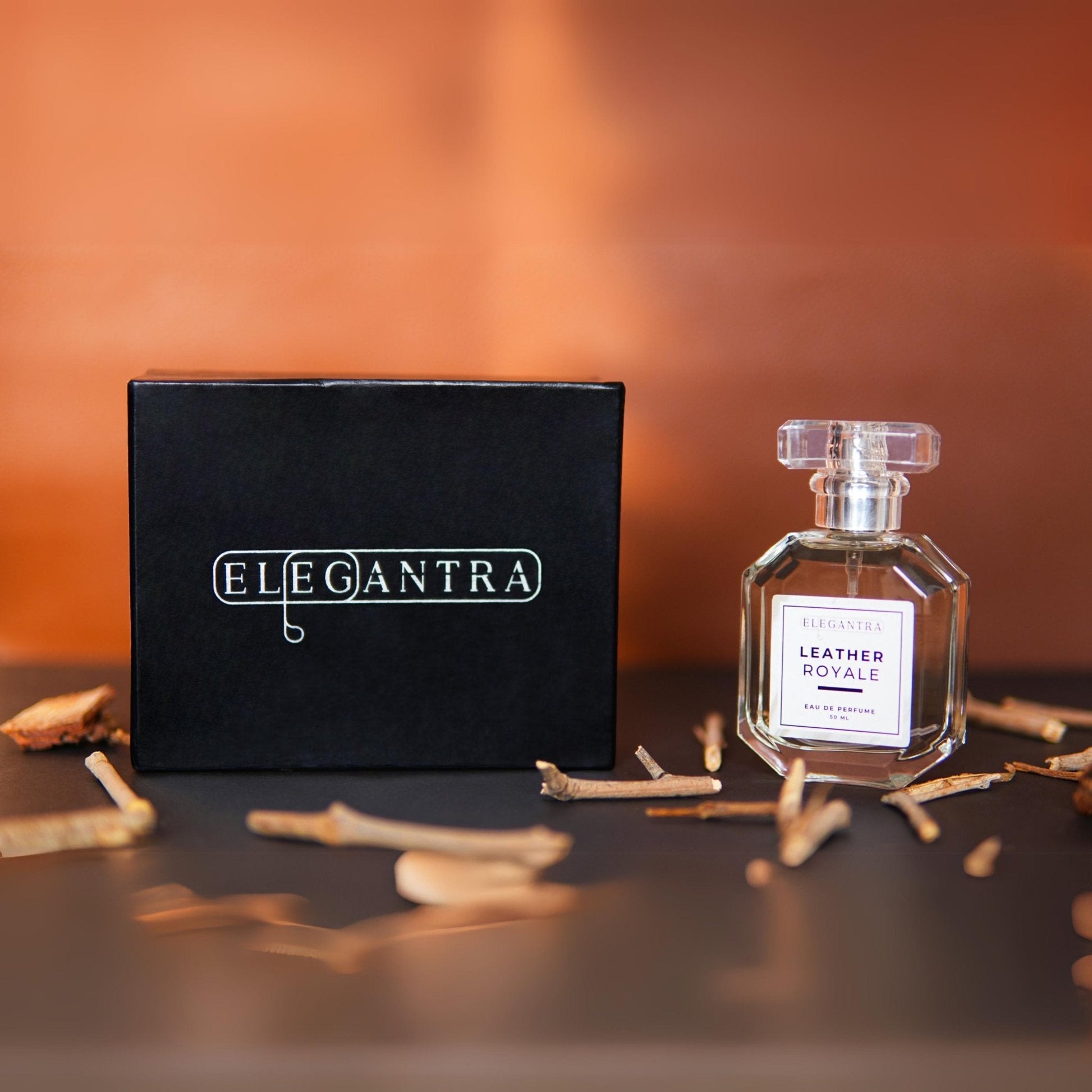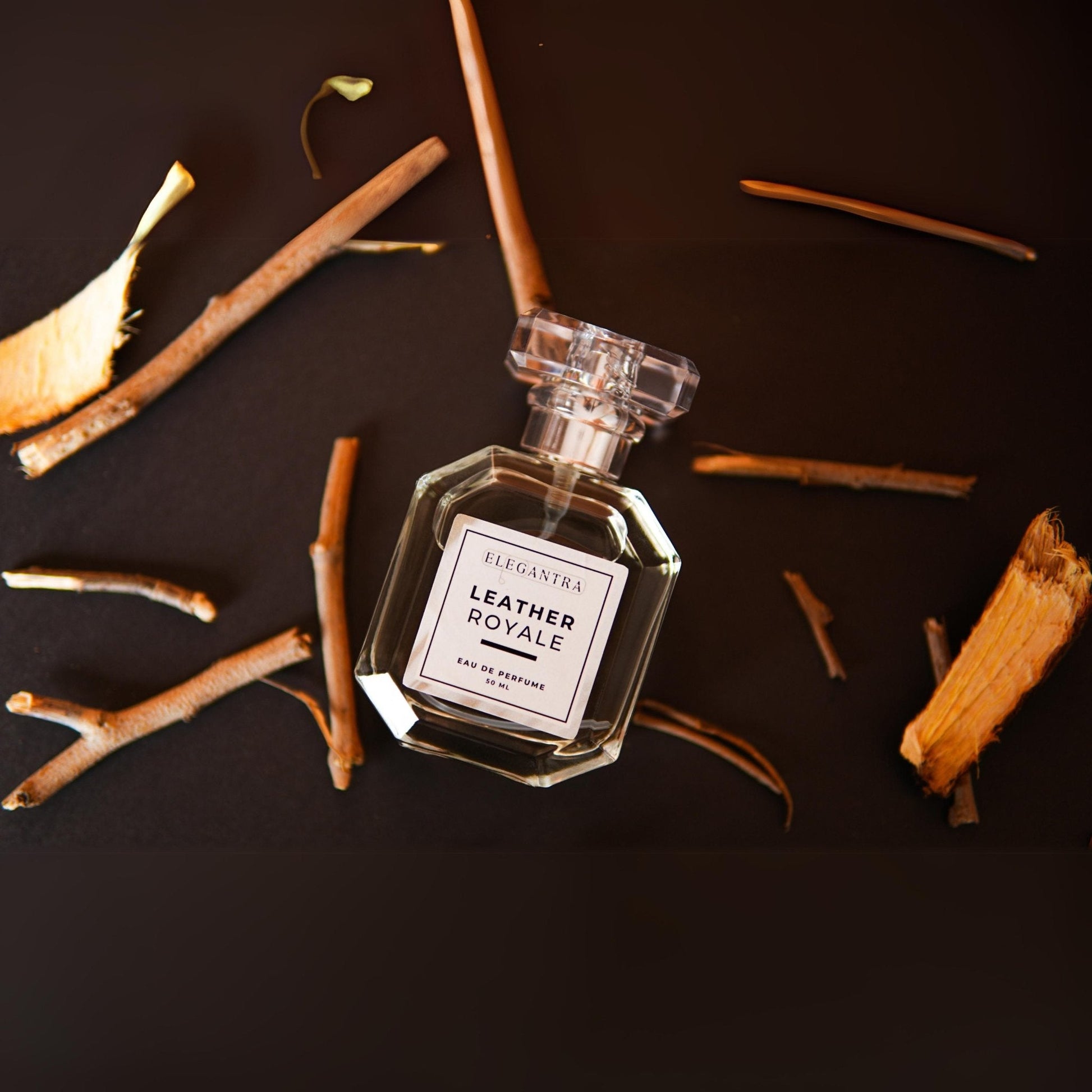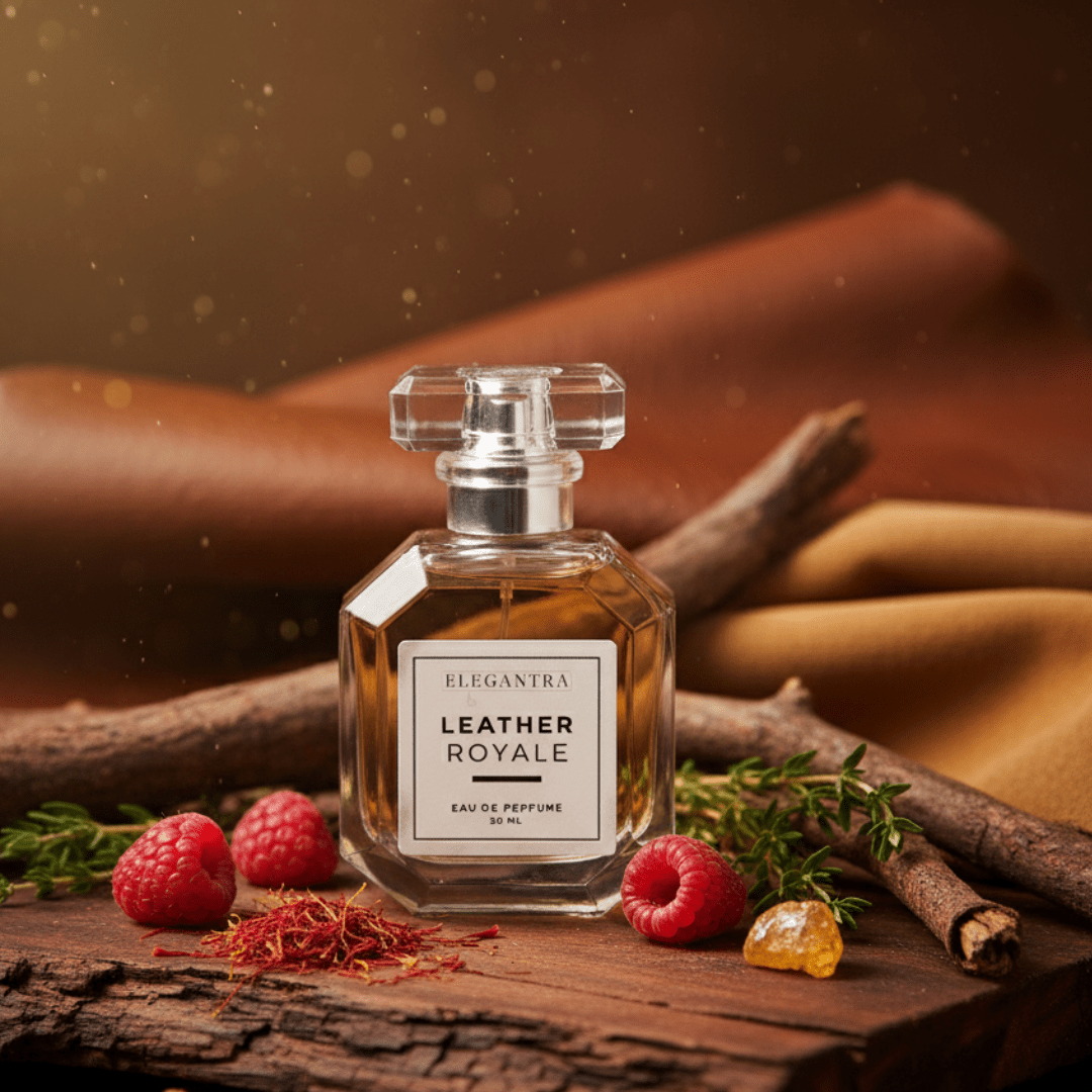 Leather Royale: A commanding fragrance with a vibrant raspberry and saffron introduction, unfolding into a rich leather and woody embrace for a lasting impression.